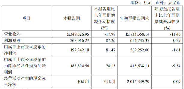 其中第三季度,公司实现营业收入5,349,626.95万元,同比下降17.98%;归属于上市公司股东的净利润197,242.10万元,同比增长81.47%;归属于上市公司股东的扣除非经常性损益的净利润188,894.56万元,同比增长74.15%。