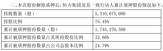 恒力石化2025年10月23日披露的关于控股股东之一致行动人解除部分股份质押的公告显示,控股股东恒力集团及其一致行动人目前合计持有公司股份5,310,675,080股,持股比例为75.45%,累计质押公司股份1,745,270,500股,占其所持有公司股份的32.86%,占公司总股本的24.79%。