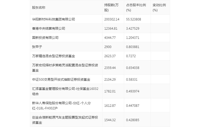 半年报显示,2024年上半年末公司十大流通股东中,新进股东为国新投资有限公司、汇添富基金管理股份有限公司-社保基金16032组合、新华人寿保险股份有限公司-分红-个人分红-018L-FH002沪,取代了一季度末的全国社保基金四一一组合、万家新利灵活配置混合型证券投资基金、国泰中证煤炭交易型开放式指数证券投资基金。在具体持股比例上,香港中央结算有限公司、张甲子、万家精选混合型证券投资基金、中证500交易型开放式指数证券投资基金、创金合信新能源汽车主题股票型发起式证券投资基金持股有所上升,万家宏观择时多策略灵活配置混合型证券投资基金持股有所下降。