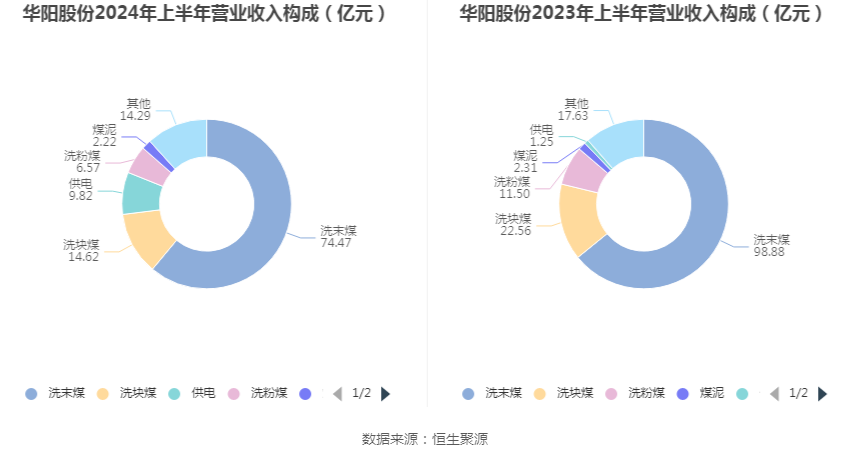 分产品来看,2024年上半年公司主营业务中,洗末煤收入74.47亿元,同比下降24.68%,占营业收入的61.05%;洗块煤收入14.62亿元,同比下降35.22%,占营业收入的11.98%;供电收入9.82亿元,同比增长686.69%,占营业收入的8.05%。