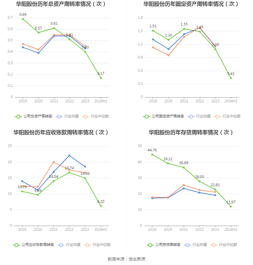 营运能力方面,2024年上半年,公司总资产周转率为0.17次,上年同期为0.22次(2023年上半年行业平均值为0.23次,公司位居同行业7/12);固定资产周转率为0.43次,上年同期为0.67次(2023年上半年行业平均值为0.69次,公司位居同行业7/12);公司应收账款周转率、存货周转率分别为6.20次、11.97次。