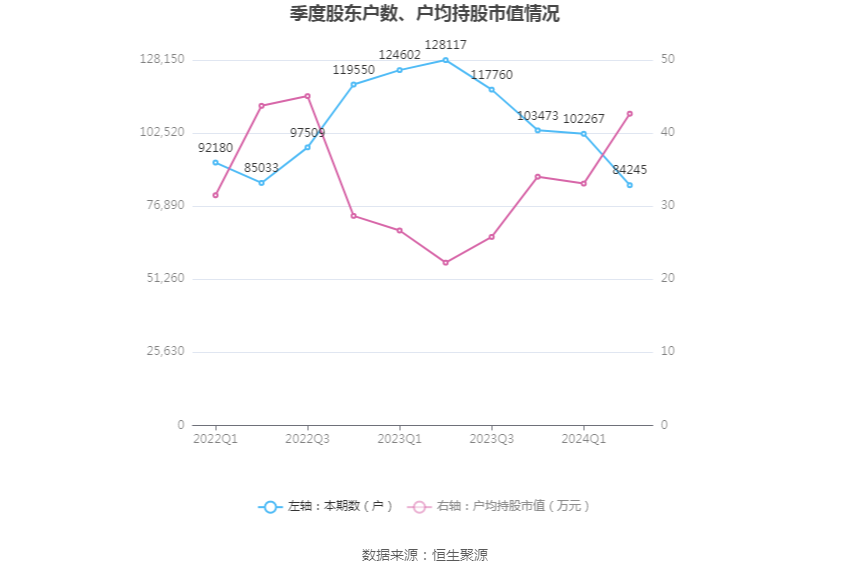 筹码集中度方面,截至2024年上半年末,公司股东总户数为8.42万户,较一季度末下降了1.8万户,降幅17.62%;户均持股市值由一季度末的33.09万元上升至42.65万元,增幅为28.89%。