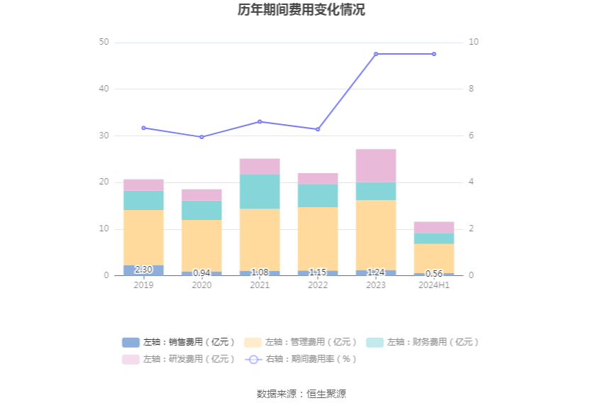 2024年上半年,公司期间费用为11.61亿元,较上年同期增加1.47亿元;期间费用率为9.51%,较上年同期上升2.93个百分点。其中,销售费用同比下降16.03%,管理费用同比下降3.22%,研发费用同比增长126.38%,财务费用同比增长23.29%。