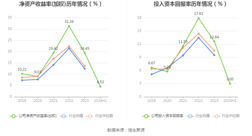 数据显示,2024年上半年公司加权平均净资产收益率为4.53%,较上年同期下降6.58个百分点;公司2024年上半年投入资本回报率为3.00%,较上年同期下降4.06个百分点。