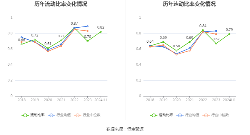2024年上半年,公司流动比率为0.82,速动比率为0.79。