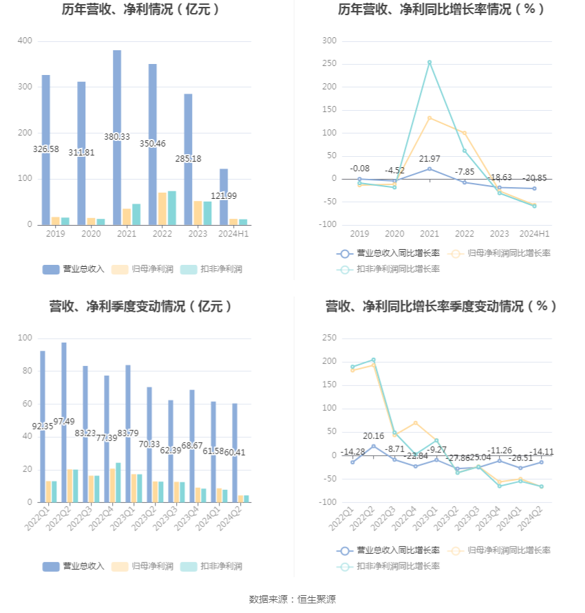 根据半年报,公司第二季度实现营业总收入60.41亿元,同比下降14.11%,环比下降1.90%;归母净利润4.32亿元,同比下降66.41%,环比下降50.24%;扣非净利润4.35亿元,同比下降65.79%,环比下降44.20%。