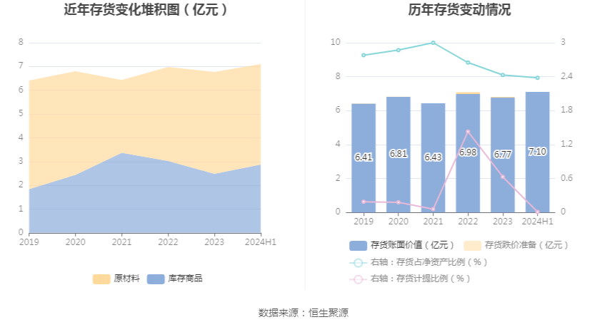 从存货变动来看,截至2024年上半年末,公司存货账面价值为7.1亿元,占净资产的2.38%,较上年末增加3329.48万元。其中,存货跌价准备为5.45万元,计提比例为0.01%。