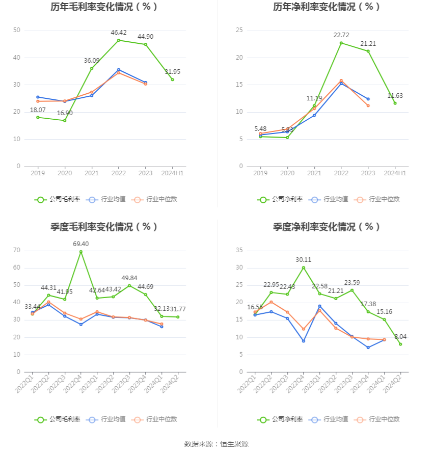 2024年上半年,公司毛利率为31.95%,同比下降11.05个百分点;净利率为11.63%,较上年同期下降10.33个百分点。从单季度指标来看,2024年第二季度公司毛利率为31.77%,同比下降11.65个百分点,环比下降0.36个百分点;净利率为8.04%,较上年同期下降13.17个百分点,较上一季度下降7.12个百分点。