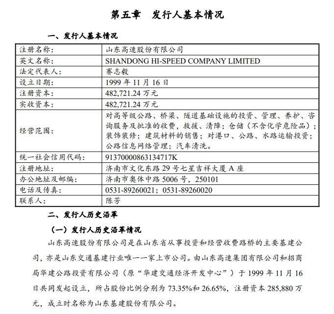 山东高速股份有限公司,法定代表人为赛志毅,注册资本为482,721.24 万元。由山东高速集团有限公司和招商局华建公路投资有限公司于1999 年11 月16日共同发起设立,所占股份比例分别为73.35%和26.65%。截至募集说明书签署日,发行人控股股东为山东高速集团。