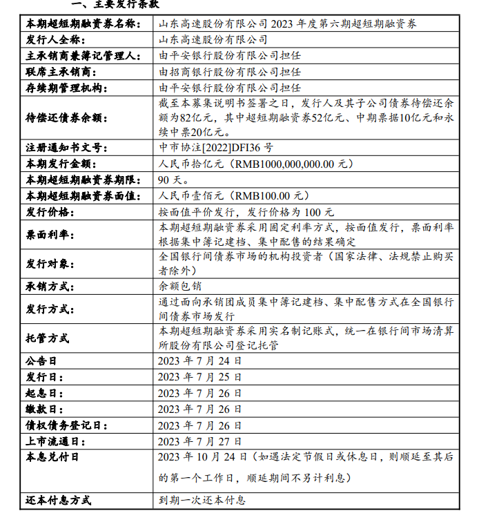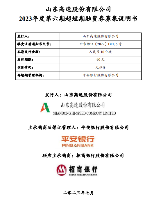 日前,上海清算所公布了山东高速股份有限公司2023年度第六期超短期融资券发行文件。该公司此次发行总额为人民币10 亿元,期限为90天。