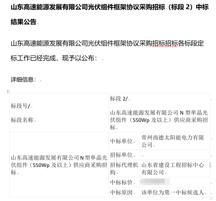 近日,山东高速能源发展有限公司发布光伏组件框架协议采购招标中标结果公告,尚德电力凭借深厚的品牌底蕴、先进的产品技术、全流程的服务宗旨突出重围,成功中标(标段2)N型组件200MW项目。