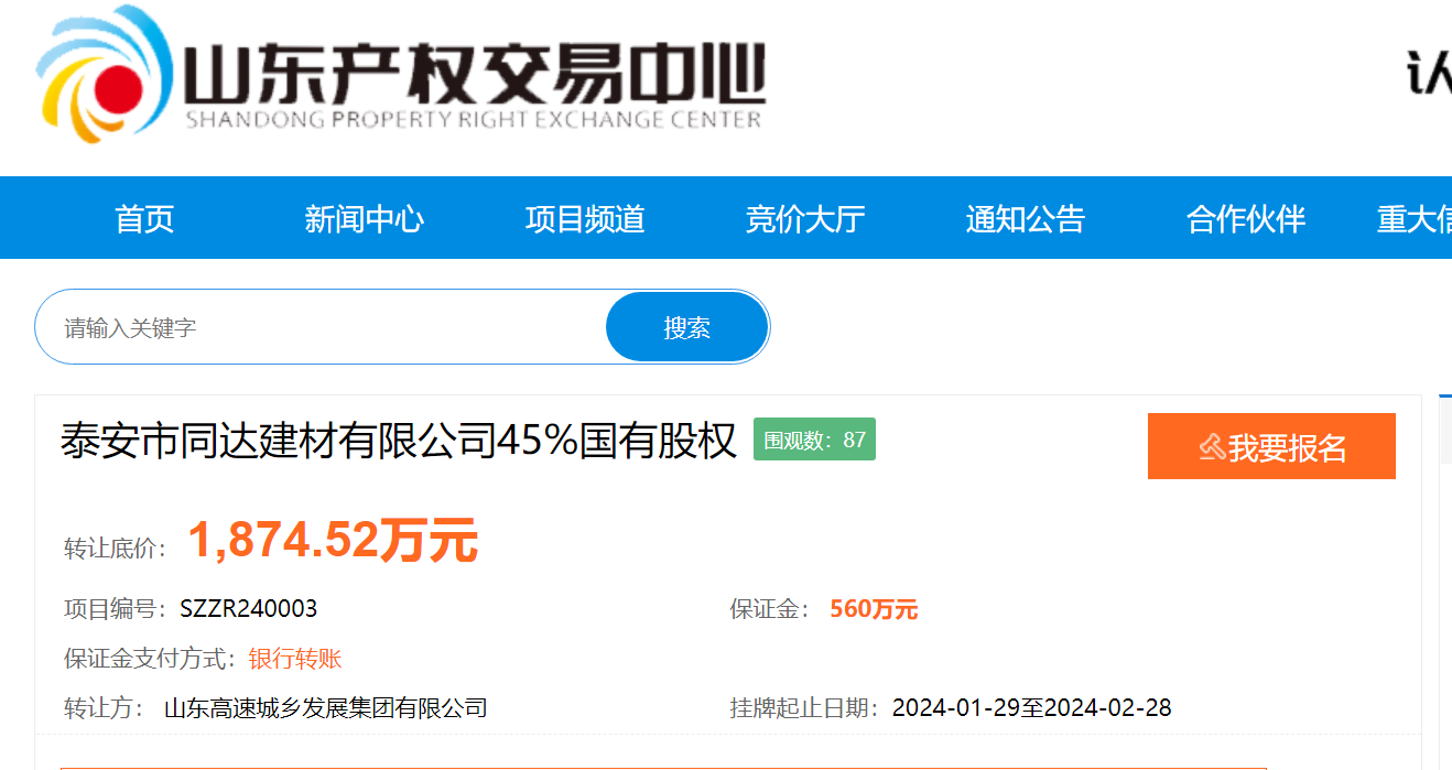 乐居财经李兰 1月30日,据山东产权交易中心,泰安市同达建材有限公司(以下简称“同达建材”)45%国有股权挂牌转让,底价1874.52万元。