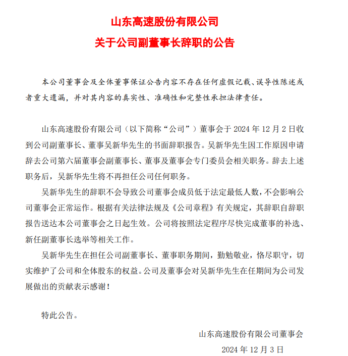山东高速集团旗下上市公司山东高速股份有限公司(山东高速,600350.SH)发布公告称,公司董事会于2024年12月2日收到公司副董事长、董事吴新华的书面辞职报告。吴新华因工作原因申请辞去公司第六届董事会副董事长、董事及董事会专门委员会相关职务。辞去上述职务后,吴新华将不再担任公司任何职务。吴新华的辞职不会导致公司董事会成员低于法定最低人数,不会影响公司董事会正常运作。