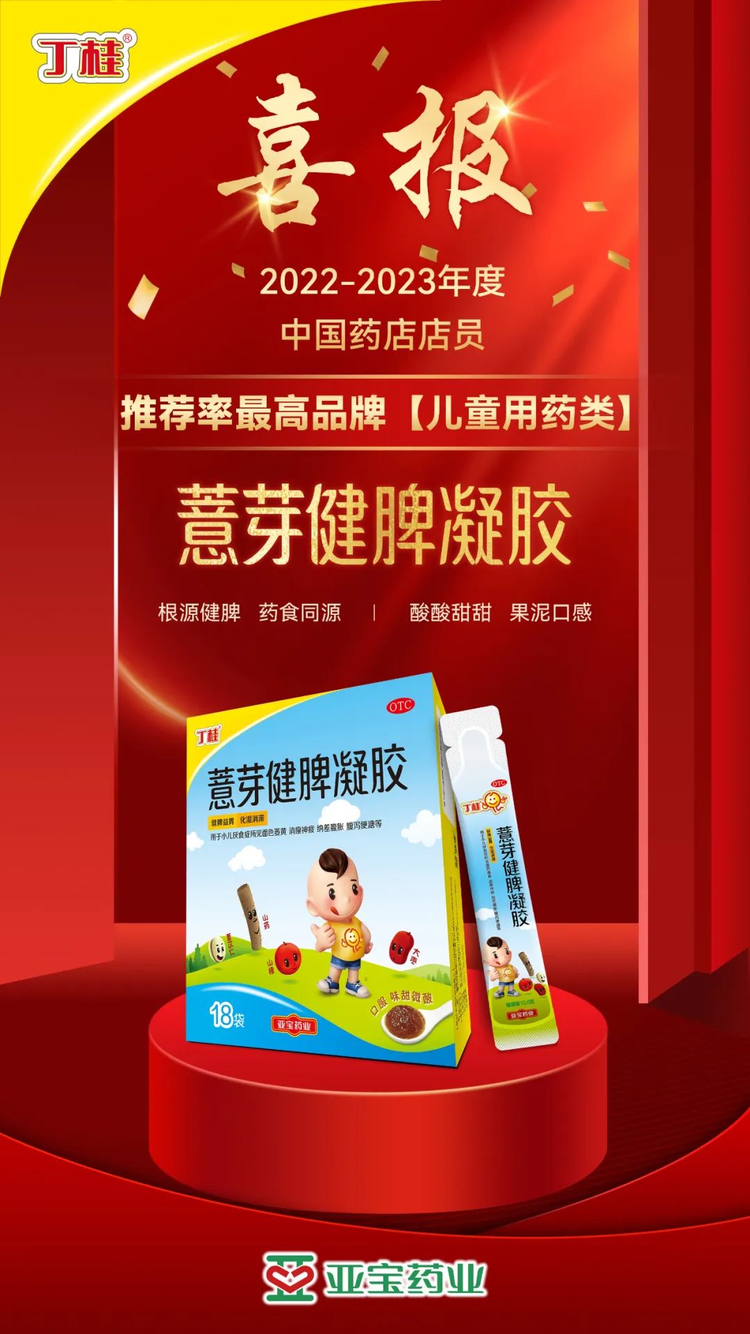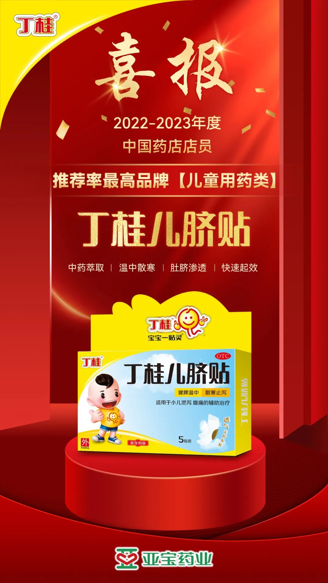 近日,由《中国药店》杂志社举办的“2022-2023年度中国药店发展报告暨中国药店价值榜发布会”在浙江湖州举行。会上发布了“2022-2023年度中国药店店员推荐率最高品牌”奖,亚宝药业集团两大儿科产品丁桂?丁桂儿脐贴和丁桂?薏芽健脾凝胶双双斩获儿童用药类“中国药店店员推荐率最高品牌”奖。