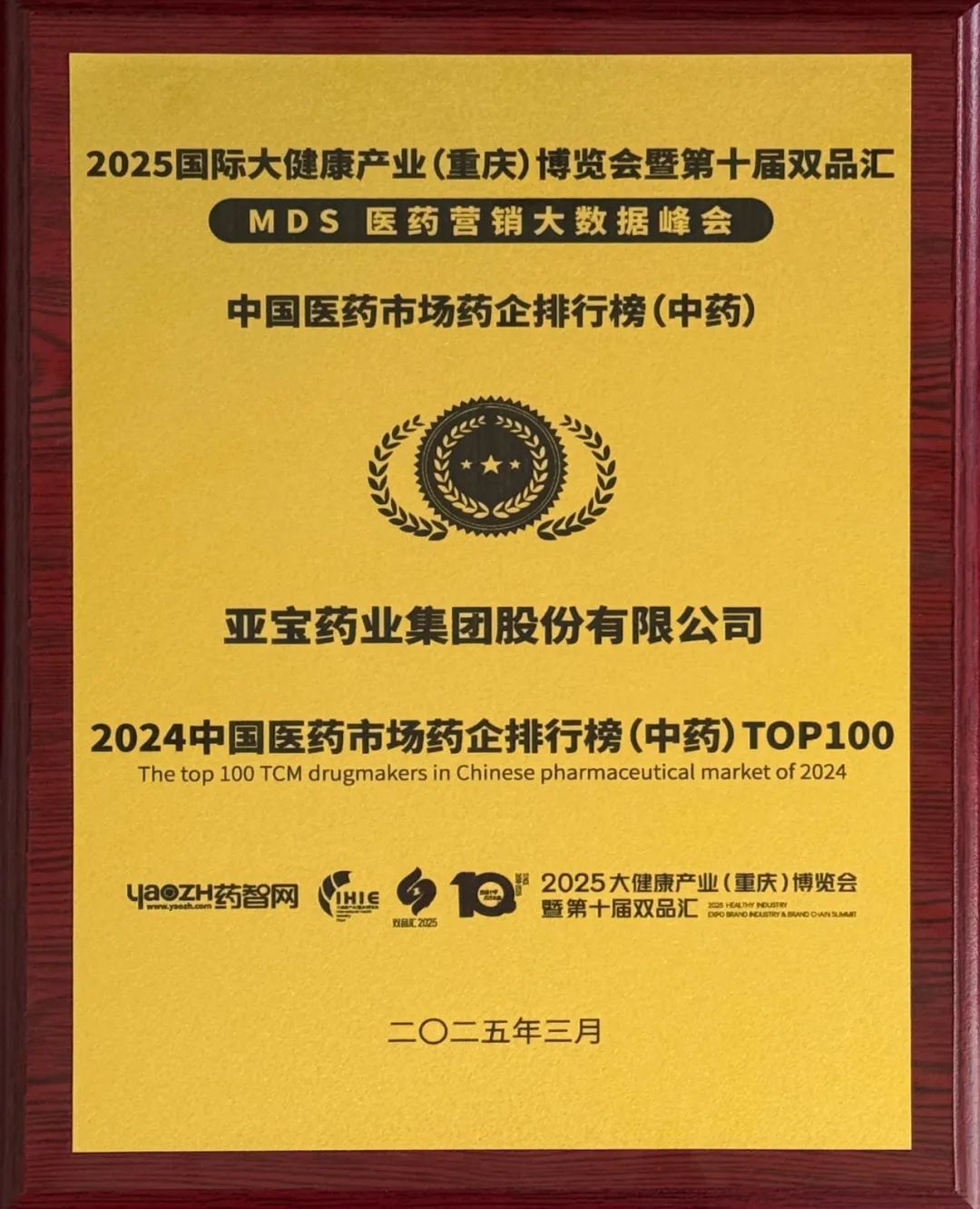 3月28日,在药智网、重庆医药行业协会、重庆中盟医药联合主办的MDS 2025第二届医药营销大数据峰会现场,备受瞩目的“2024中国医药市场药企排行榜”系列榜单正式发布。亚宝药业集团荣登2024中国医药市场药企排行榜(中药)百强榜单,位列第90名。