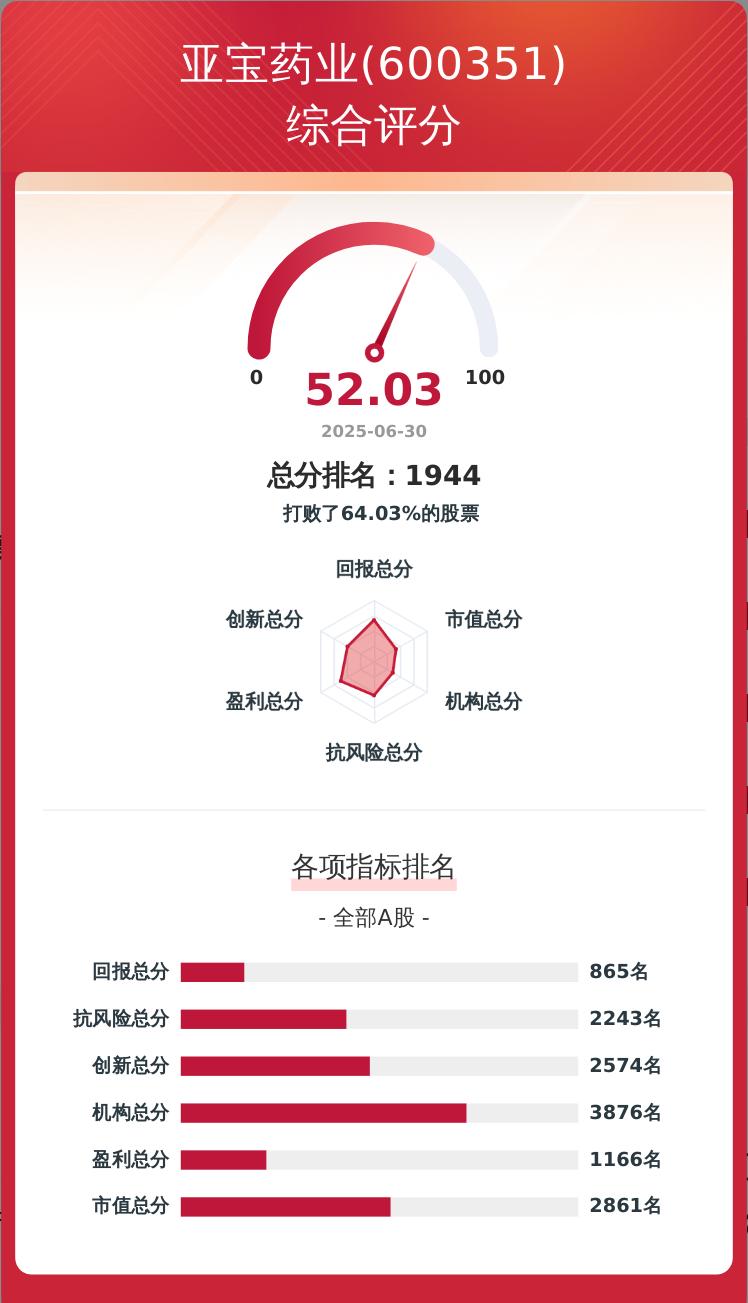 上市公司研究院构建了一套上市公司韧性评价体系,从企业盈利、科技创新、股东回报、经营抗风险、市值表现及机构吸引力六个维度对企业进行量化评分,满分为100分。亚宝药业的韧性评价总分为52.03分,在A股5405家可比上市公司中排名第1944位。