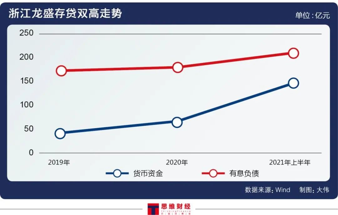 加上本文前述的拟出资不超80亿元现金参与和利时的私有化,短短两个多月的时间,浙江龙盛就抛出了近160亿元的对外投资计划,超出手中的货币资金十多亿元。中报显示,公司包含受限资金在内的货币资金仅为145.22亿元,有息负债总额则高达205.42亿元。