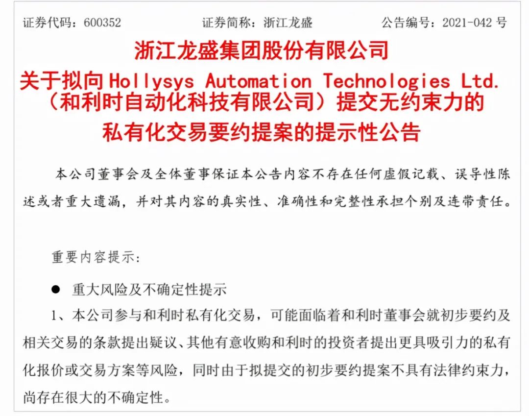 一是仅就交易本身而言,存在和利时董事会就初步要约及相关交易的条款提出疑议、其他有意收购和利时的投资者提出更具吸引力的私有化报价或交易方案等风险,同时由于拟提交的初步要约提案不具有法律约束力,尚存在很大的不确定性。