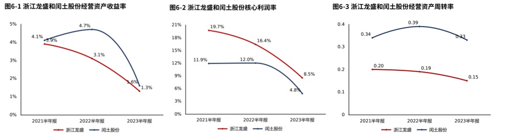 “染料”贡献了绝大部分收入,但由于国内经济复苏不及预期,下游需求下滑导致竞争加剧,产品整体毛利率下滑,与此同时,相对较高毛利产品“燃料”以及“中间体”的占比也在下滑,浙江龙盛产品整体竞争力表现为减弱。同时叠加费用支出增长,经营活动盈利性快速下滑。经营资产质量恶化,总资产报酬率下滑,ROE下滑。