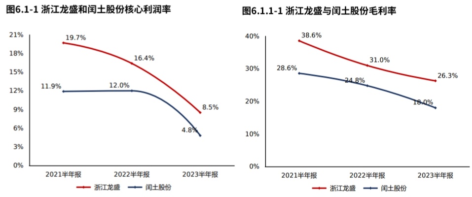 浙江龙盛2023半年报较2022半年报核心利润率的降低主要源于毛利率的降低。浙江龙盛2023半年报毛利率26.32%,与2022半年报相比,毛利率下滑4.72个百分点,毛利率降低。