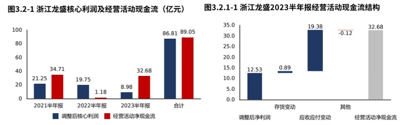 浙江龙盛2023半年报经营活动调整后盈利12.53亿元,存货销售带来现金流入0.89亿元,应收应付变动导致现金流入19.38亿元,其他因素导致现金流出0.12亿元,最终经营活动实现现金净流入32.68亿元。