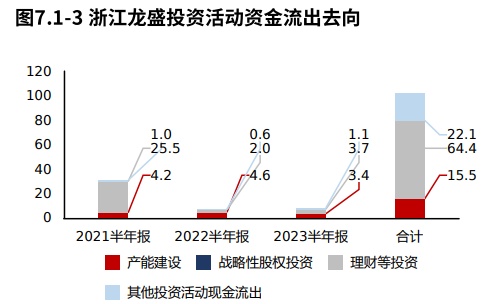 浙江龙盛2023半年报的投资活动资金流出,理财等投资占比最大,占比45.32%,此外产能建设也占比较大。浙江龙盛2021年报到本期的投资活动资金流出,理财等投资占比最大,占比63.10%。