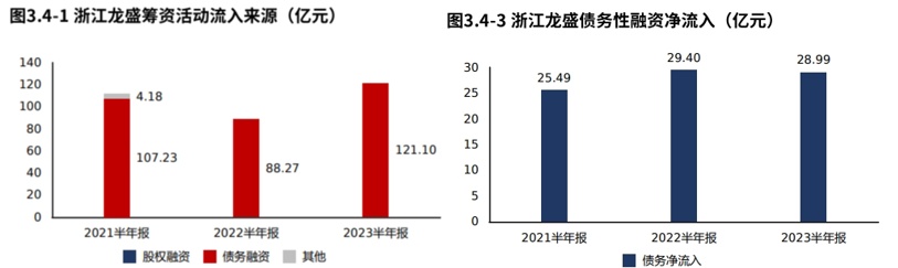 浙江龙盛2023半年报筹资活动现金流入121.10亿元,较2022半年报增加32.84亿元,增速37.20%,筹资活动现金流入快速增加。浙江龙盛2023半年报绝大部分筹资流入来源于债权流入(100.00%)。