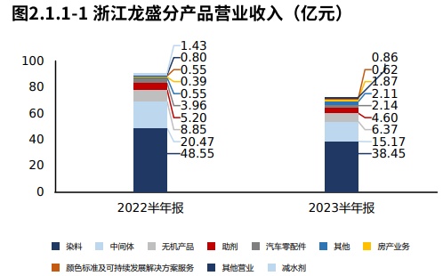 从产品的分类角度看浙江龙盛的主营构成,“染料”是最大的收入构成,占比53.26%,贡献了绝大部分收入。与2022半年报相比,产品项目的披露发生一定改变,取消“减水剂”。其中,“染料”、“中间体”产品销售的下滑是营业收入下滑的主要原因。