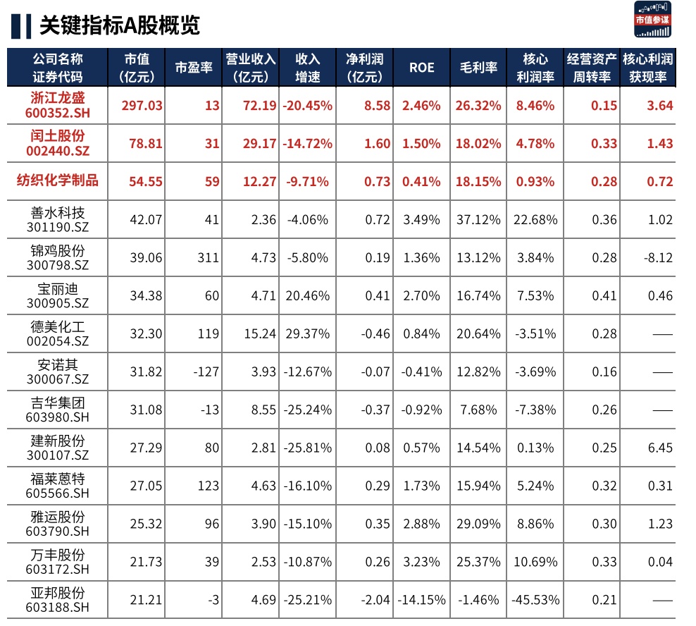 浙江龙盛的营收以及净利润在行业中具有明显体量优势,但市盈率在行业中偏低。