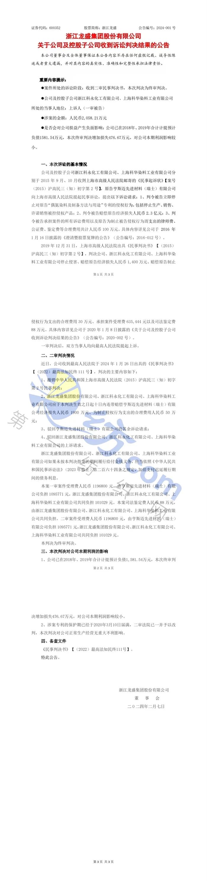 浙江龙盛集团股份有限公司(以下简称“浙江龙盛”)今天(2月6日)披露,公司近日收到最高人民法院于1月26日出具的《民事判决书》(以下简称“《判决书》”),《判决书》显示:浙江龙盛、浙江科永化工有限公司(以下简称“科永化工”)、上海科华染料工业有限公司(以下简称“科华染料”)应于本判决生效之日起十日内连带赔偿亨斯迈先进材料(瑞士)有限公司经济损失1900万元、为制止侵权行为支出的合理费用50万元;驳回亨斯迈先进材料(瑞士)有限公司(以下简称“亨斯迈”)的其余诉讼请求;驳回浙江龙盛、科永化工、科华染料的上诉请求‘撤销上海市高院(2015)沪高民三(知)初字第2号民事判决。