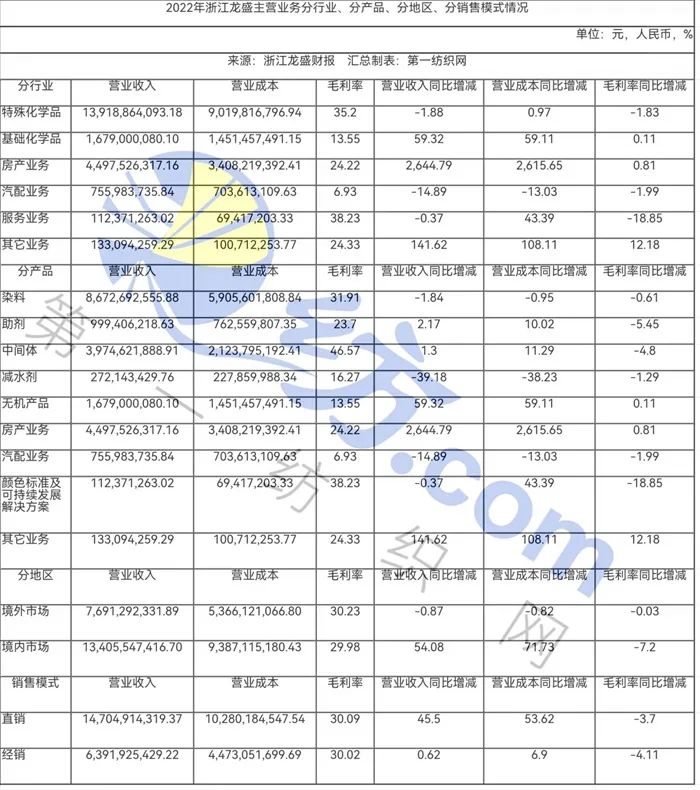 不过,第一纺织网注意到,分产品看,中间体和染料业务依然是浙江龙盛利润的主要来源,报告期内,公司中间体的销量达8.79万吨,分散染料产销量则再创历史新高,在染料行业不少企业已经出现亏损的严峻形势下,浙江龙盛的染料业务继续保持盈利。同期,公司染料销量高达22.71万吨。
