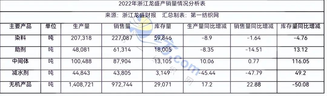 分产品看,报告期内,浙江龙盛的染料业务产量达14.46万吨,销售量16.65万吨,实现销售收入57.79亿元;助剂产量2.69万吨,销量4.20万吨,实现销售收入6.96亿元,中间体产量6.51万吨,销售量6.76万吨,实现销售收入22.50亿元。
