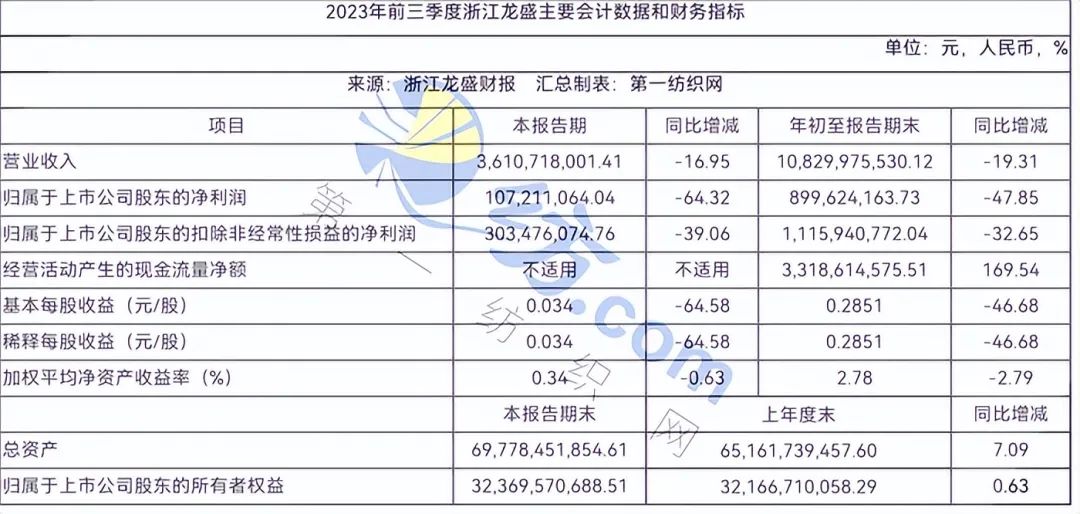2023年前三季度,浙江龙盛实现营业收入营业收入108.29亿元,同比下降19.31%,归属于上市公司股东的净利润8.99亿元,同比下降10.99%;对于业绩变动的主要原因,浙江龙盛解释称,主要系公司产品价格下跌引起的利润率下降所致。