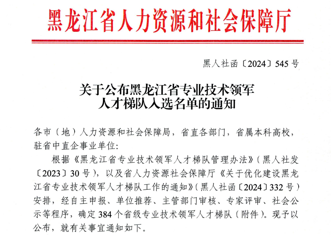 近日,黑龙江省人力资源和社会保障厅发布《关于公布黑龙江省专业技术领军人才梯队入选名单的通知》,由恒丰纸业副总经理潘高峰担任带头人,新品研发部部长白亮亮和工艺研究一室主任邬宪娜作为后备带头人组成的“造纸技术”团队成功入选。