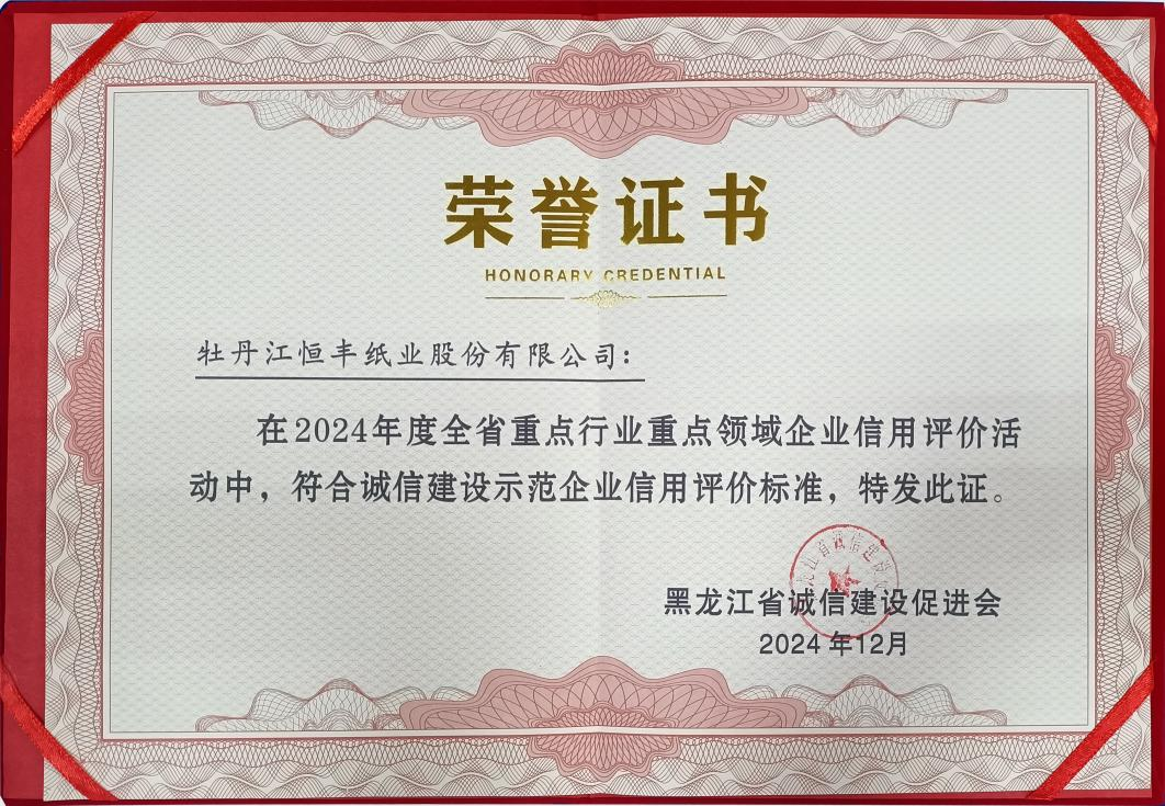 此次评选活动旨在推动黑龙江省诚信建设的深入发展,树立诚信典范,推广先进经验,并发挥诚信企业的示范引领作用,是黑龙江省诚信建设促进会组织开展的全省重点行业、重点领域信用评价活动。经过严格评审,恒丰纸业凭借其卓越的信用记录、规范的内部管理和积极的社会贡献,成功达到诚信建设示范企业的信用评价标准,荣获此项殊荣。