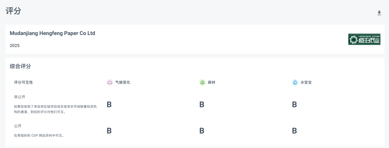 近日,全球权威环境信息披露平台CDP( 全球环境信息研究中心 )公布了2025年度企业评级结果。 恒丰纸业 在气候、水安全、森林三项问卷评级中均获评B级,实现了从2024年度的“水B、气候B、森林B-”到本年度“三项全B级”的巩固与提升。这表明公司在低碳转型与可持续发展方面的实践已获得国际权威机构的高度认可,整体环境管理水平处于国内造纸行业领先位置。