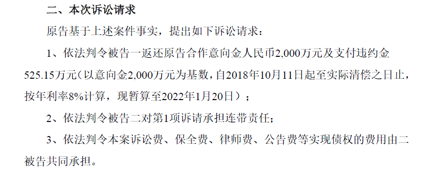 因此,国旅户外向法院提起诉讼,要求厦门君易返还合作意向金2000万元及支付违约金525.15万元,金正发对上述内容承担连带责任;同时要求厦门君易及金正发承担此次诉讼费、保全费、律师费、公告费等实现债权的费用。