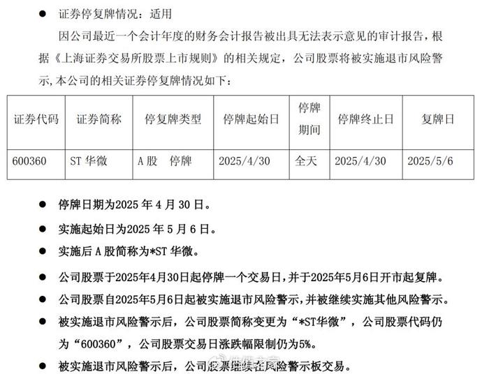 8月12日晚间,*ST华微(600360.SH)发布停牌公告,由于在责令改正规定期限(2025年8月12日)届满前未完成改正,公司股票将自2025年8月13日开市起停牌,预计停牌时间不超过2个月。