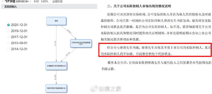 图片说明:ST华微股权向上穿透及曾涛关于代持的说明,数据来源于Wind及公司公告