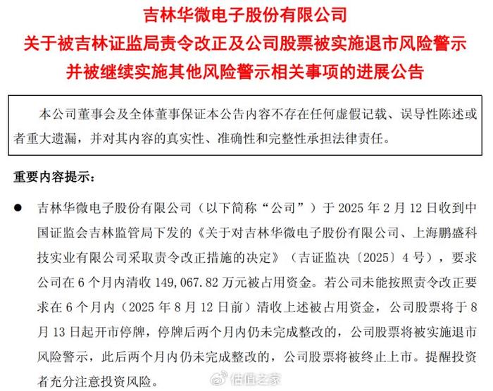 紧接着2月12日,ST华微收到吉林证监局发来的《可能被实施退市风险警示的风险提示性公告》,要求ST华微在6个月内清收约14.91亿元被占用资金,否则实施停牌,若停牌后两个月内仍未完成整改的,则面临退市。