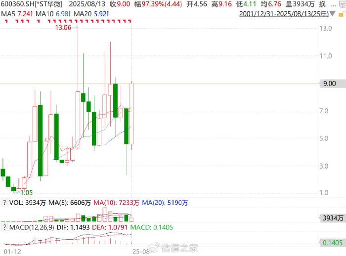 然而有趣的是,在明知8月13日起公司股票要停牌、明知公司股票存在巨大退市风险的前提下,8月12日二级市场仍然将*ST华微的股价拉了一个涨停,而年初至今公司已累计上涨97.39%,另外,从首次被ST后的股价低点2.31元/股算起,涨幅已达到289.61%。截止到8月12日,*ST华微收盘价9.00元/股,创公司自2001年上市以来,最高年度收盘价。
