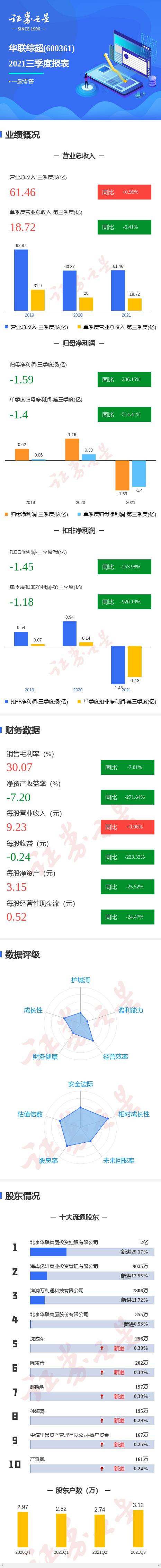 华联综超2021三季报显示,公司主营收入61.46亿元,同比上升0.96%;归母净利润-15928.79万元,同比下降236.15%;扣非净利润-14529.07万元,同比下降253.98%;其中2021年第三季度,公司单季度主营收入18.73亿元,同比下降6.41%;单季度归母净利润-14030.81万元,同比下降514.41%;单季度扣非净利润-11857.66万元,同比下降920.19%;负债率81.75%,投资收益2125.41万元,财务费用2.63亿元,毛利率30.07%。