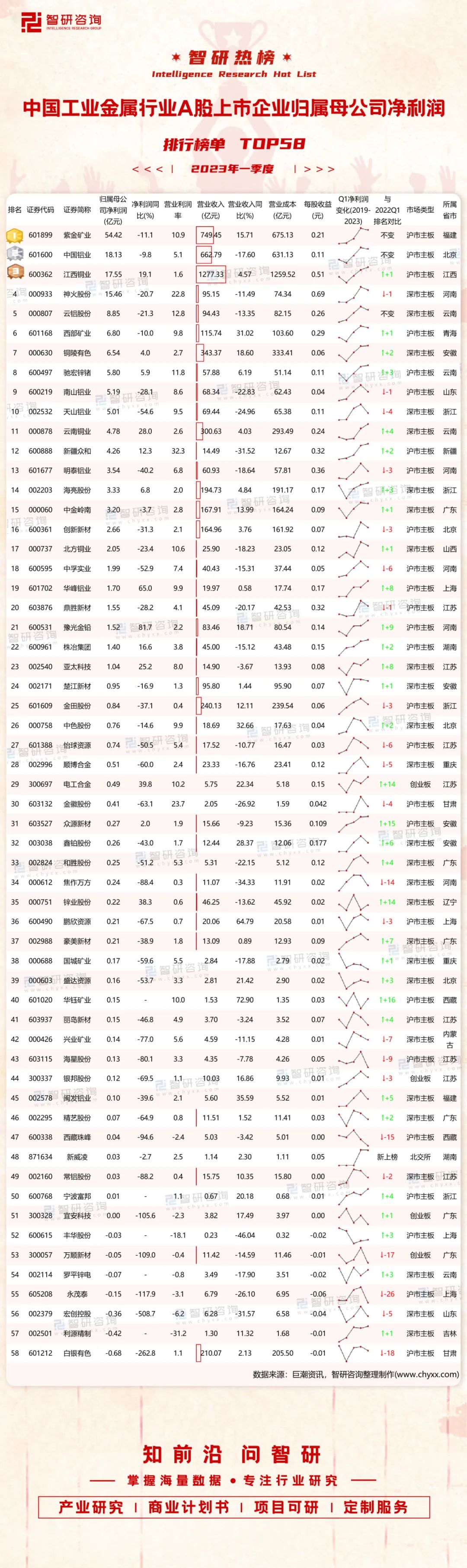 为研究中国各行各业A股上市企业披露的相关利润及营收情况,智研咨询数据中心推出《智研热榜:2023年一季度中国工业金属行业A股上市企业归属母公司净利润排行榜单TOP58》,以供参考。