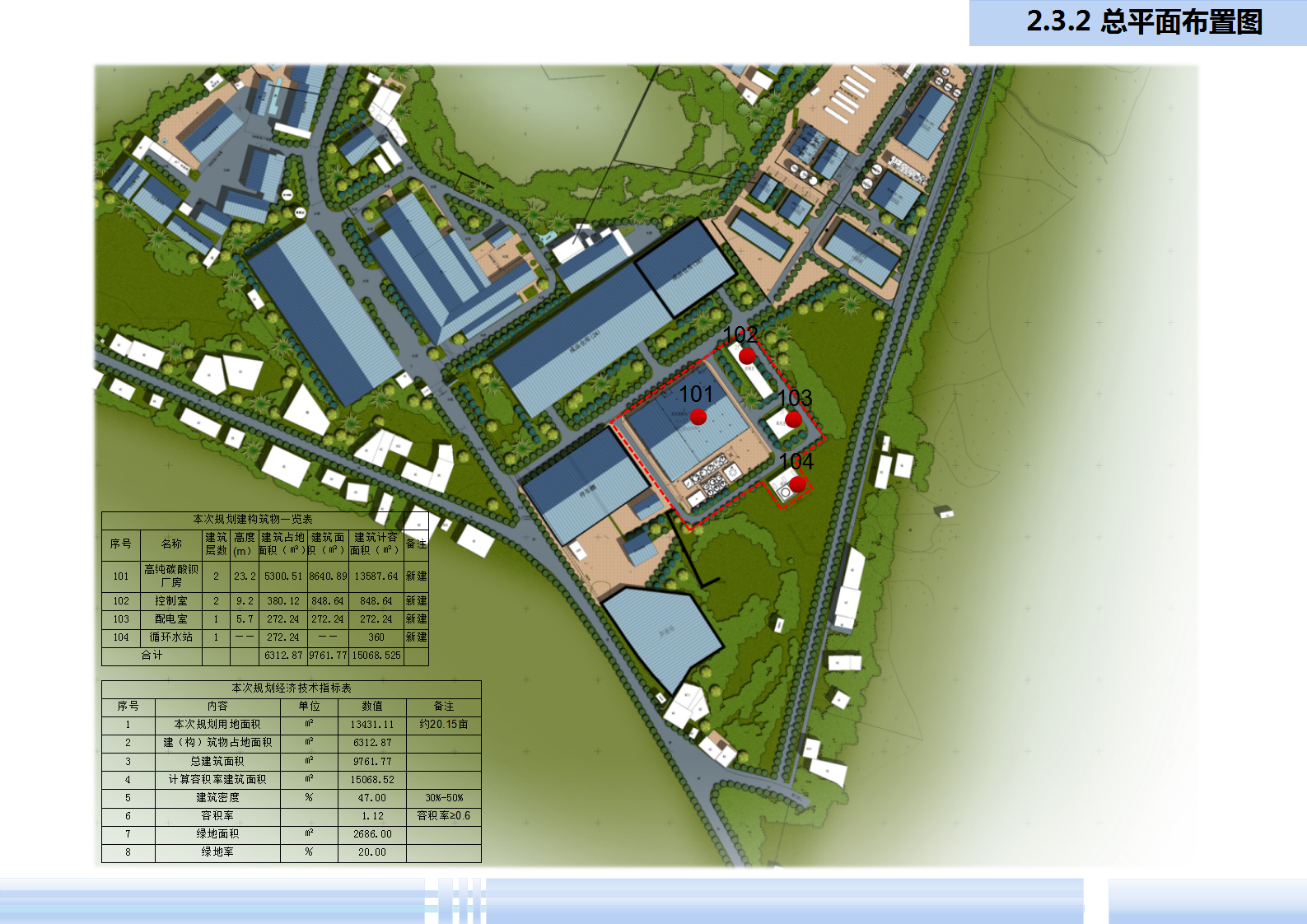 总建筑面积9761.77㎡,计容面积15068.525㎡(其中高纯碳酸钡厂房13587.64㎡、控制室848.64㎡、配电室272.24㎡、循环水站360㎡) |