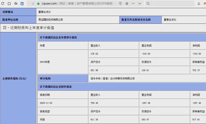从此次披露看,西证(香港)资产管理有限公司去年实现营收135万元,净利亏损310万元,今年前11个月实现营收759.45万元,净利亏损207.46万元,截至今年11月底总资产811.38万元,净资产517.91万元。