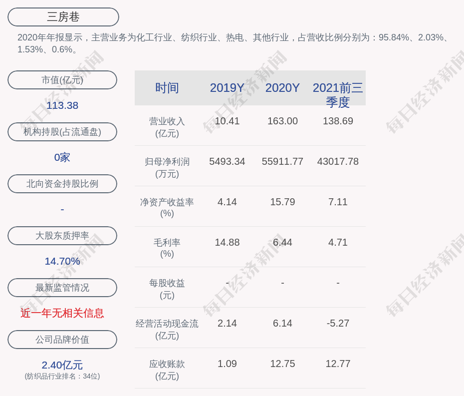 2020年年报显示,三房巷的主营业务为化工行业、纺织行业、热电、其他行业,占营收比例分别为:95.84%、2.03%、1.53%、0.6%。