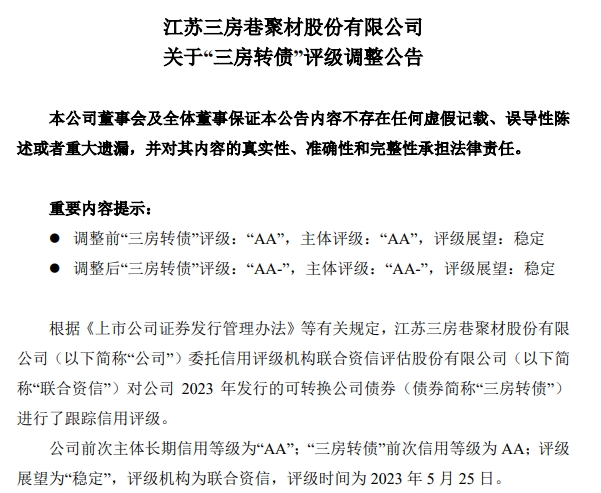 近日,评级机构联合资信下调了“三房转债”评级。据三房巷5月29日公告称,联合资信在对公司经营状况、行业情况等进行综合分析与评估的基础上,于2024年5月27日出具报告,将公司主体长期信用等级由“AA”下调为“AA-”;“三房转债”信用等级为由“AA”下调为“AA-”。