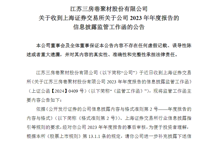 消息面上,5月30日三房巷晚间公告称,公司近日收到上交所发出的信息披露监管工作函,工作函显示,经对三房巷2023年年报的事后审核,上交所要求三房巷说明公司盈利能力是否存在不确定性以及债务规模与业绩是否匹配等情况。
