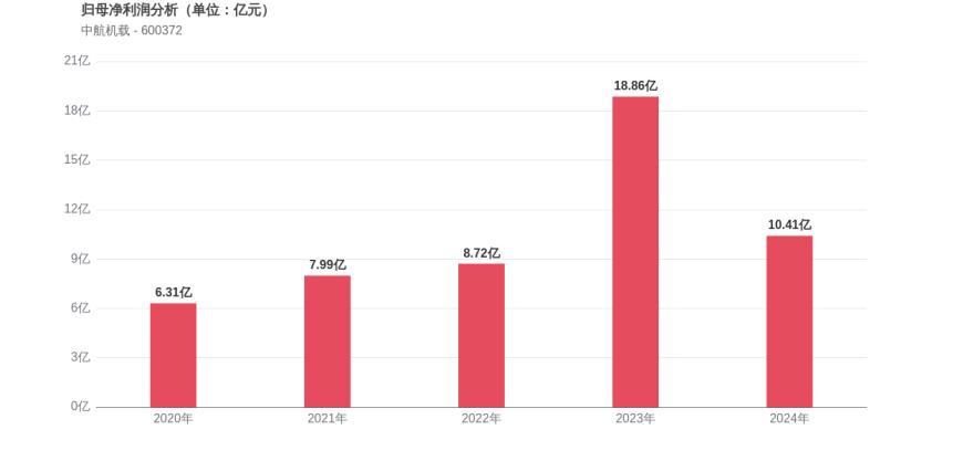 利润角度分析,2020年中航机载实现归母净利润6.31亿元,2024年10.41亿元。2023年归母净利润增速达到39.62%的高点后,2024年出现44.83%的大幅下滑。