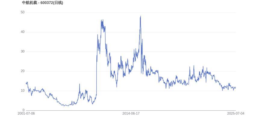 从上市首日至今,中航机载的市值实现了9.17倍的增长,显示出长期投资价值。2015年5月27日,中航机载的市值巅峰达到881.34亿元,股价也顺应升至50.1元。而至7月4日收盘,中航机载的股价为11.93元,市值为577.28亿元,相比峰值时期市值减少304.06亿元,市值蒸发了34.50%。